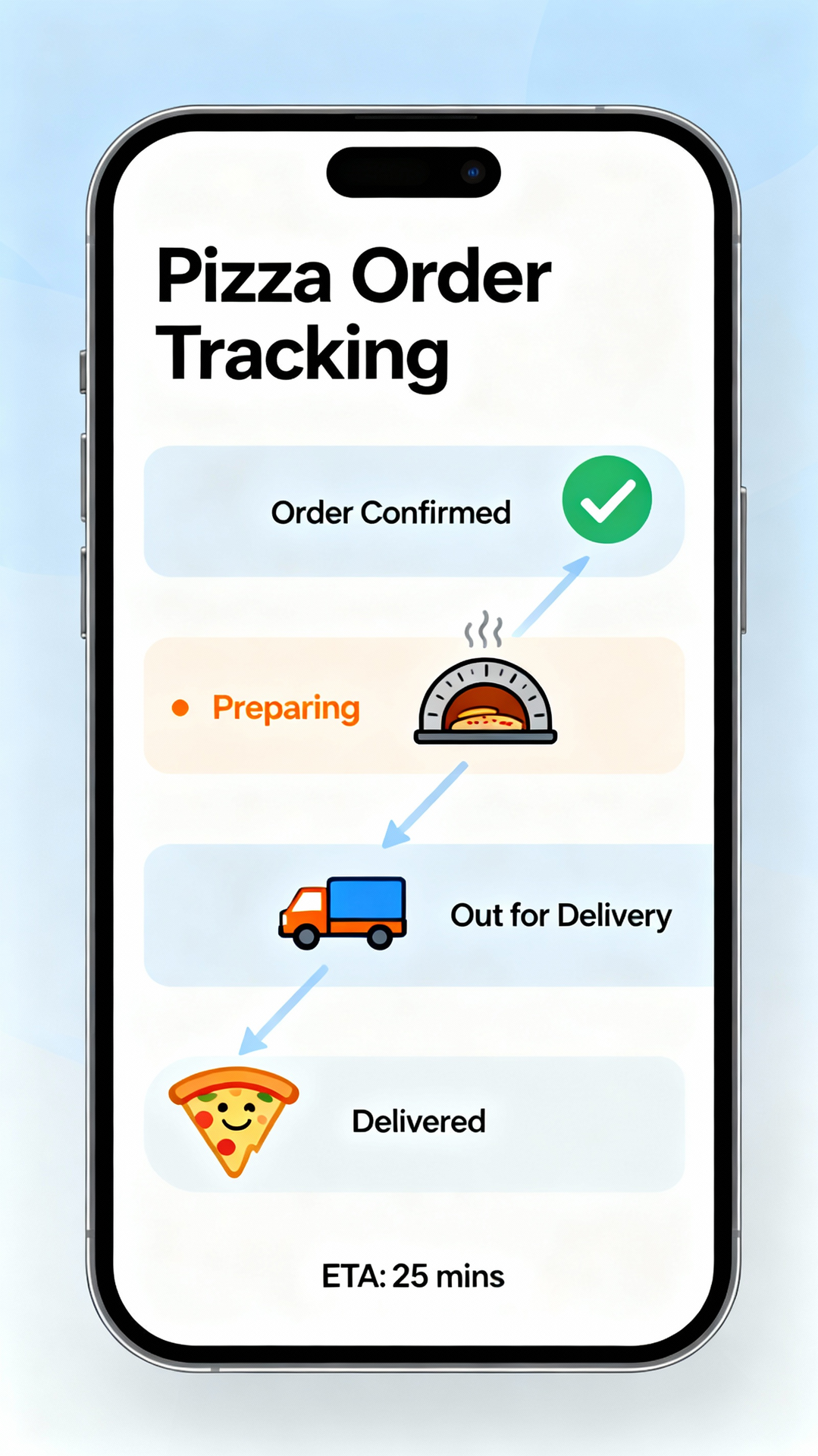 Pizza Tracker app showing real-time order tracking from preparation to delivery